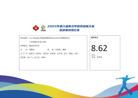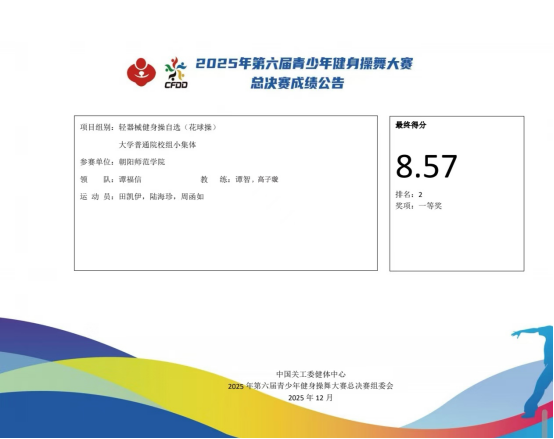 2025年12月14日至17日,中国关心下一代工作委员会健康体育发展中心成功举办了第六届青少年健身操舞大赛总决赛。我校健美操训练队积极备赛,全力以赴,共选派两个项目参赛,在激烈的角逐中脱颖而出,荣获大学普通院校组全民健身操舞等级规定动作有氧舞蹈四级第一名;大学普通院校组轻器械健身操自选动作(花球操)第二名。